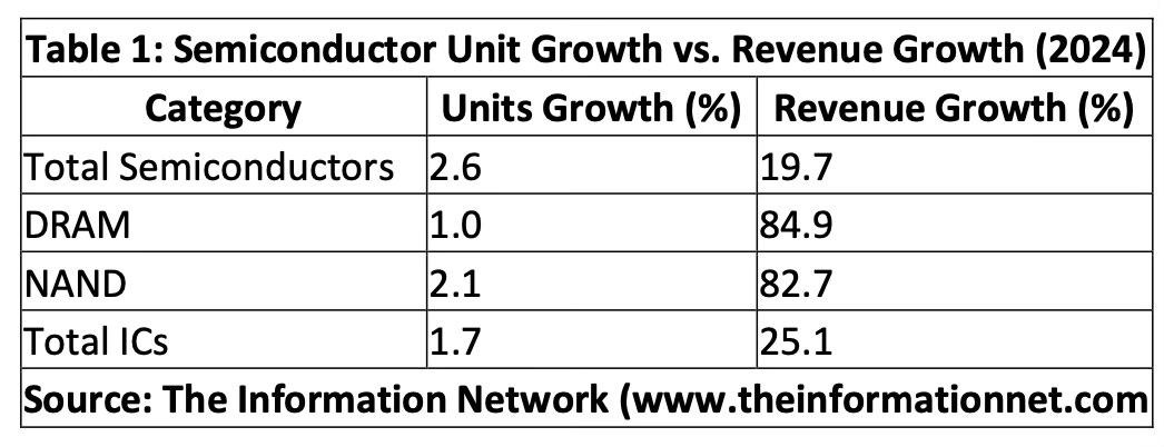 Table 1 highlights how revenue growth has far outpaced unit growth across all major semiconductor categories, underscoring the increasing role of ASPs in driving revenue, according to my report at The Information Network entitled Global Semiconductor Equipment: Markets, Market Shares and Market Forecasts.