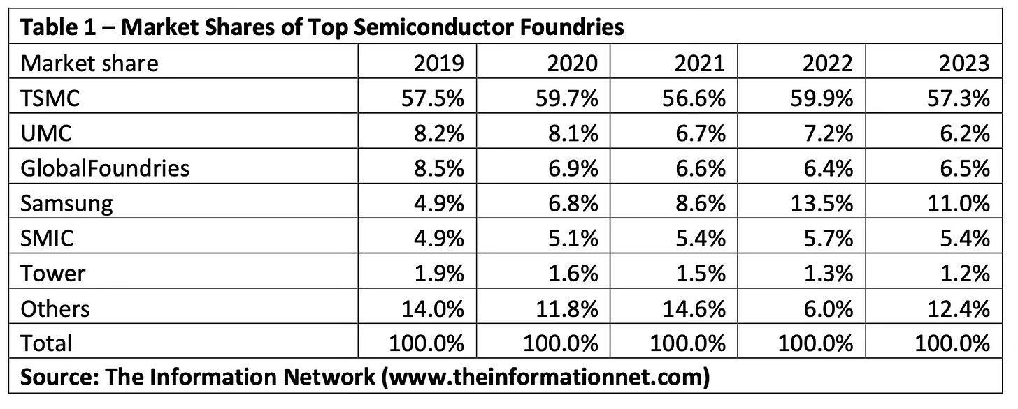 TSMC is the undisputed leader in the semiconductor foundry market, holding a 57% of the global market share as of 2023 (Table 1). It has established itself as the preferred foundry for high-performance computing and mobile devices, with its 5nm and 3nm nodes setting industry standards. The company is also pushing for 2nm production by 2025, further cementing its technological leadership, according to The Information Network’s report entitled Global Semiconductor Equipment: Markets, Market Shares and Market Forecasts.