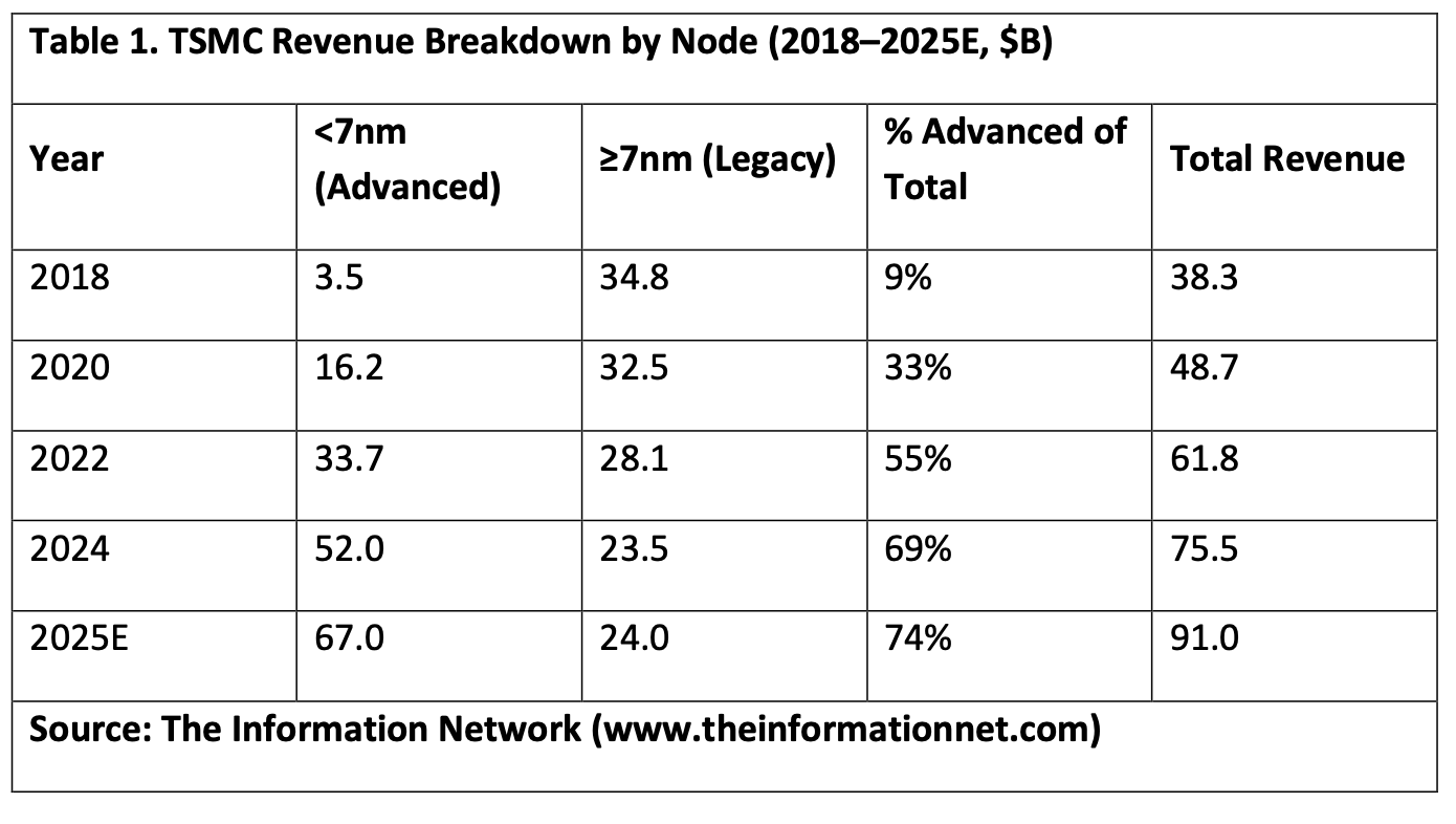 TSMC’s revenue composition has dramatically transformed in the last seven years. Advanced nodes — defined as 7nm and below — once accounted for less than 10% of revenues, but now represent nearly 70% of the company’s topline. The progression from 7nm to 5nm and now to 3nm has been relentless, with 2nm on track for volume production in the second half of 2025. Data for this article came from my Technical-Marketing report entitled Global Semiconductor Equipment: Markets, Market Shares and Market Forecasts.